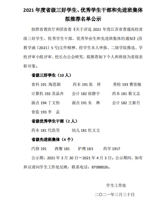 2021 年度省级三好员工、优秀员工干部和先进班集体 拟推荐名单公示