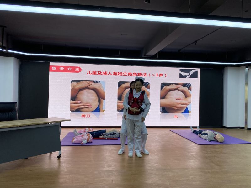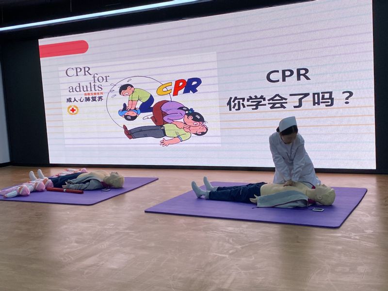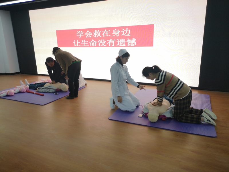 志愿者为在场社区居民、青年职工详细讲解心肺复苏术和海姆立克急救法的实施步骤,使在场社区居民和青年职工在愉快活跃的气氛中切身体会并掌握急救知识。