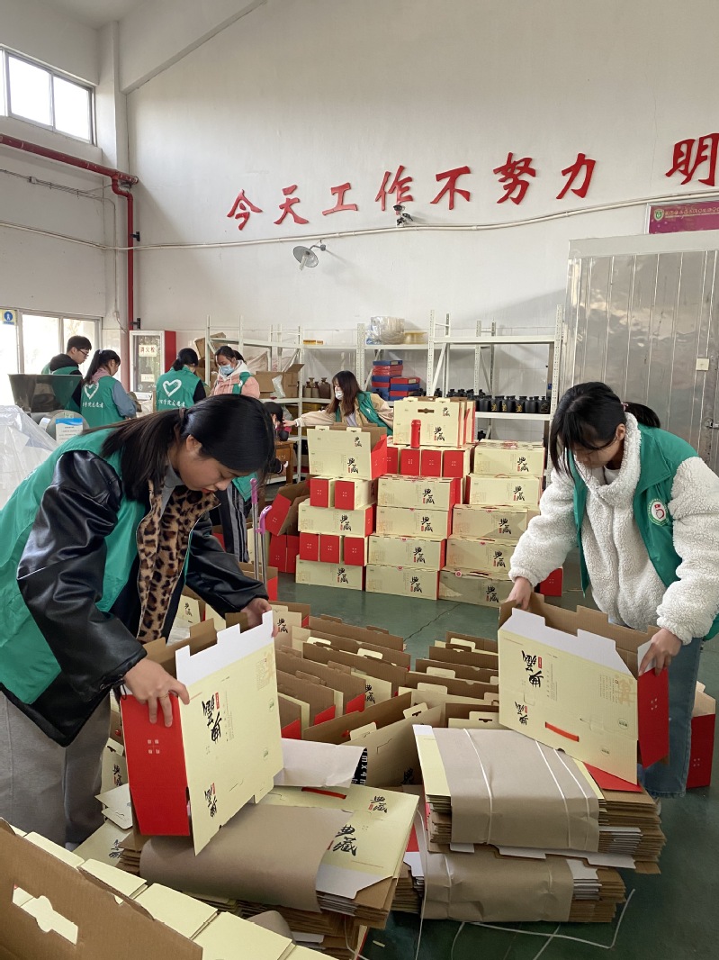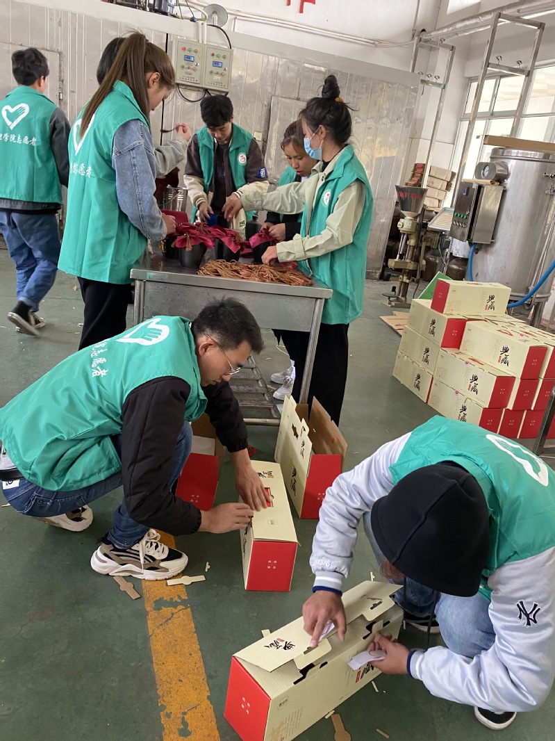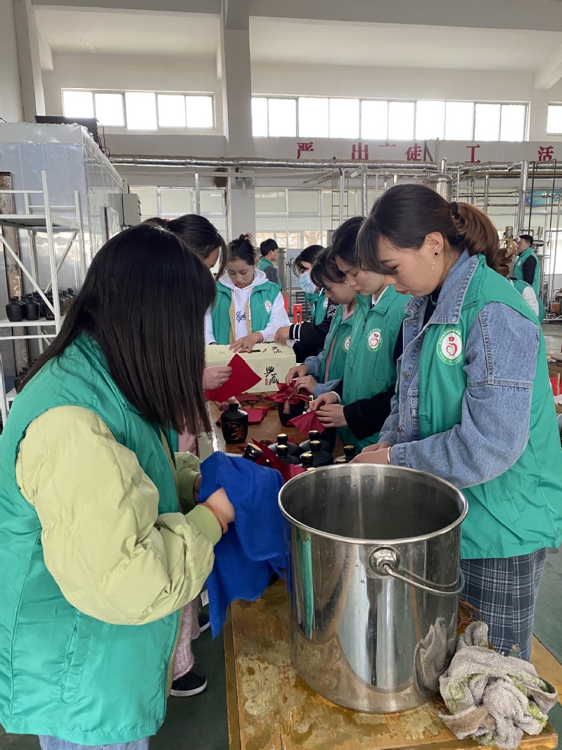 志愿者们首先参观了黄酒车间,对黄酒生产的过程进行了详细的了解,在车间黄老师的指导下,志愿者们组成两条生产线,黄酒传递、擦净瓶身、美化包装、装箱、打包、贴标,无缝隙合作,两个小时完成了接近两千瓶黄酒的工作量。从开始的新奇到高强度工作后的身体疲倦,大家感受到了生产一线工作人员的辛劳。来自青海自治区的公保吉同学说:“整个流水下来真的特别累,手上动作不断,还要不停的弯腰起身,这次志愿服务不仅仅让我们增长了见识,更加体会到了一线生产工人的不易。能够走出家乡,在这样优美的环境以及那么多认真负责的老师的校园里学习,我是幸运的”。