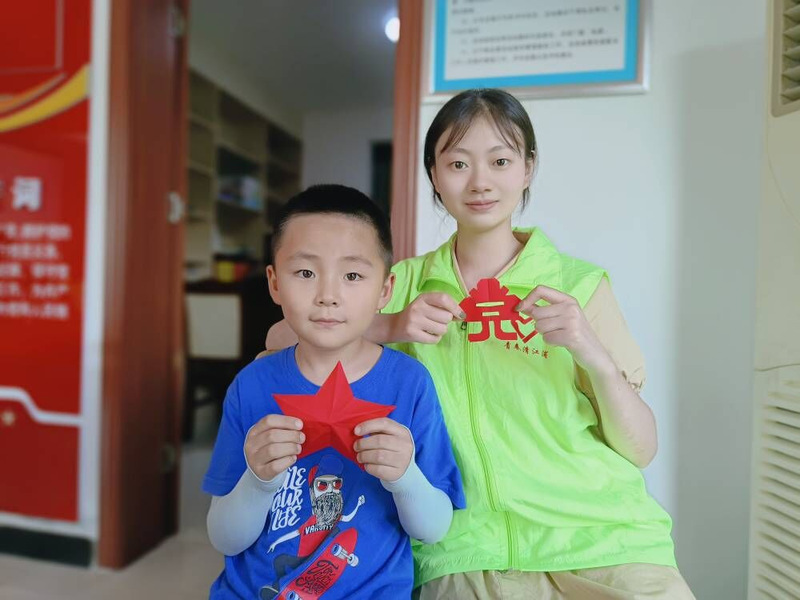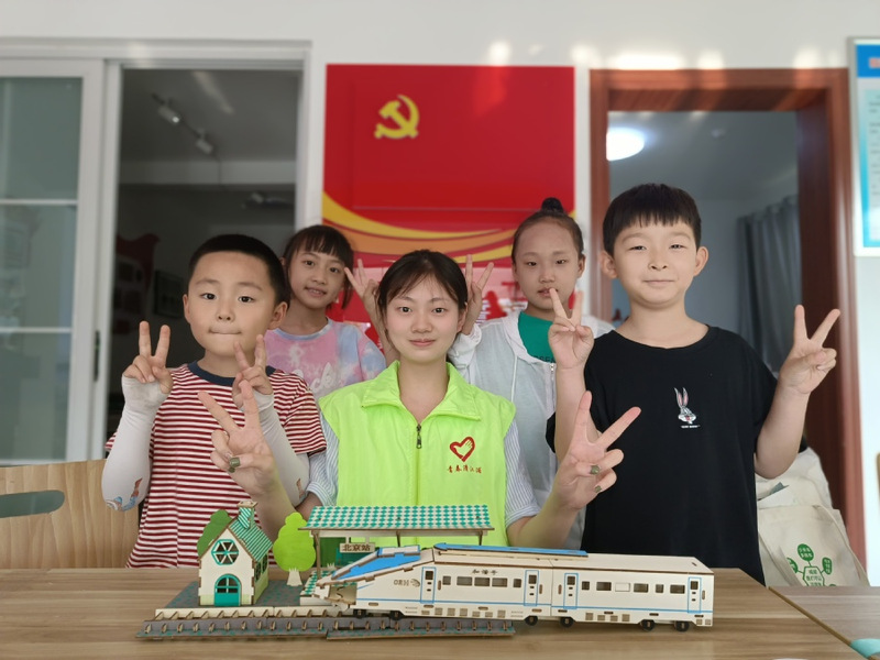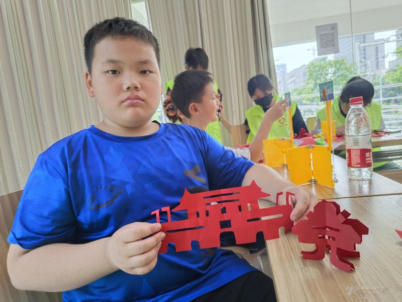 剪刀与红纸交错,孩子们在志愿者们的带领下学习了中国传统工艺——剪纸。从最简单的红五星,到剪“党”字,剪天安门剪影,再到志愿者们为孩子们展示传统窗花的剪法。随后,志愿者们带领孩子拼起了模型:和谐号、天安门、红船……每一个模型就是一个红色精神的里程碑,让孩子们寓教于乐,在玩乐中学习了红色历史、红色精神,宣传了党的百年奋斗历程。