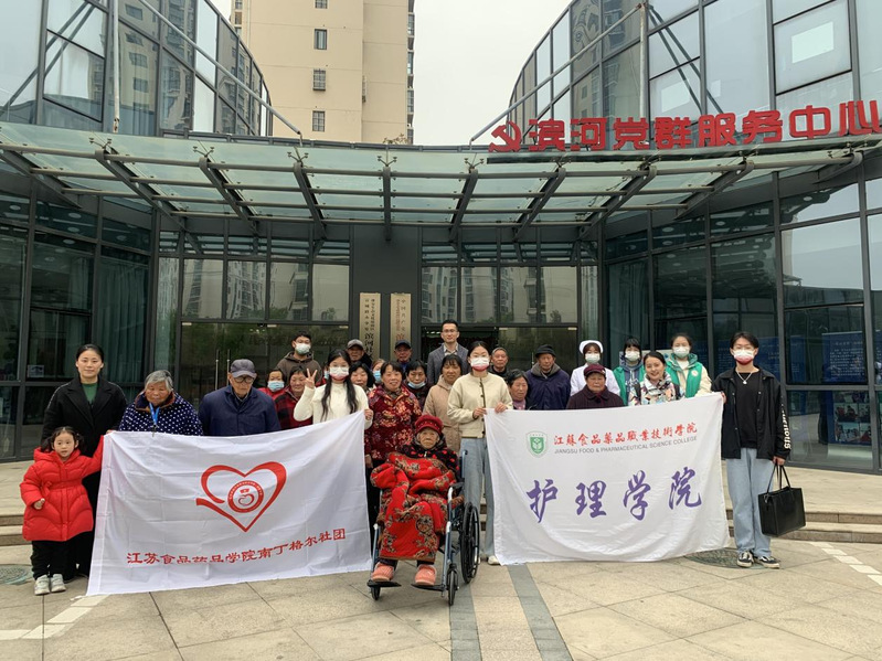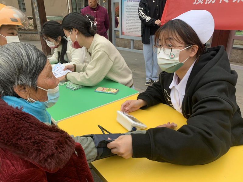 在测量血压的工作台周围,挤满了前来参与活动的社区居民。南丁格尔社团志愿者与老师一起为居民免费测量血压,并分发了口罩、中药香囊等防疫物品,为社区居民带来了春天的问候与关怀。