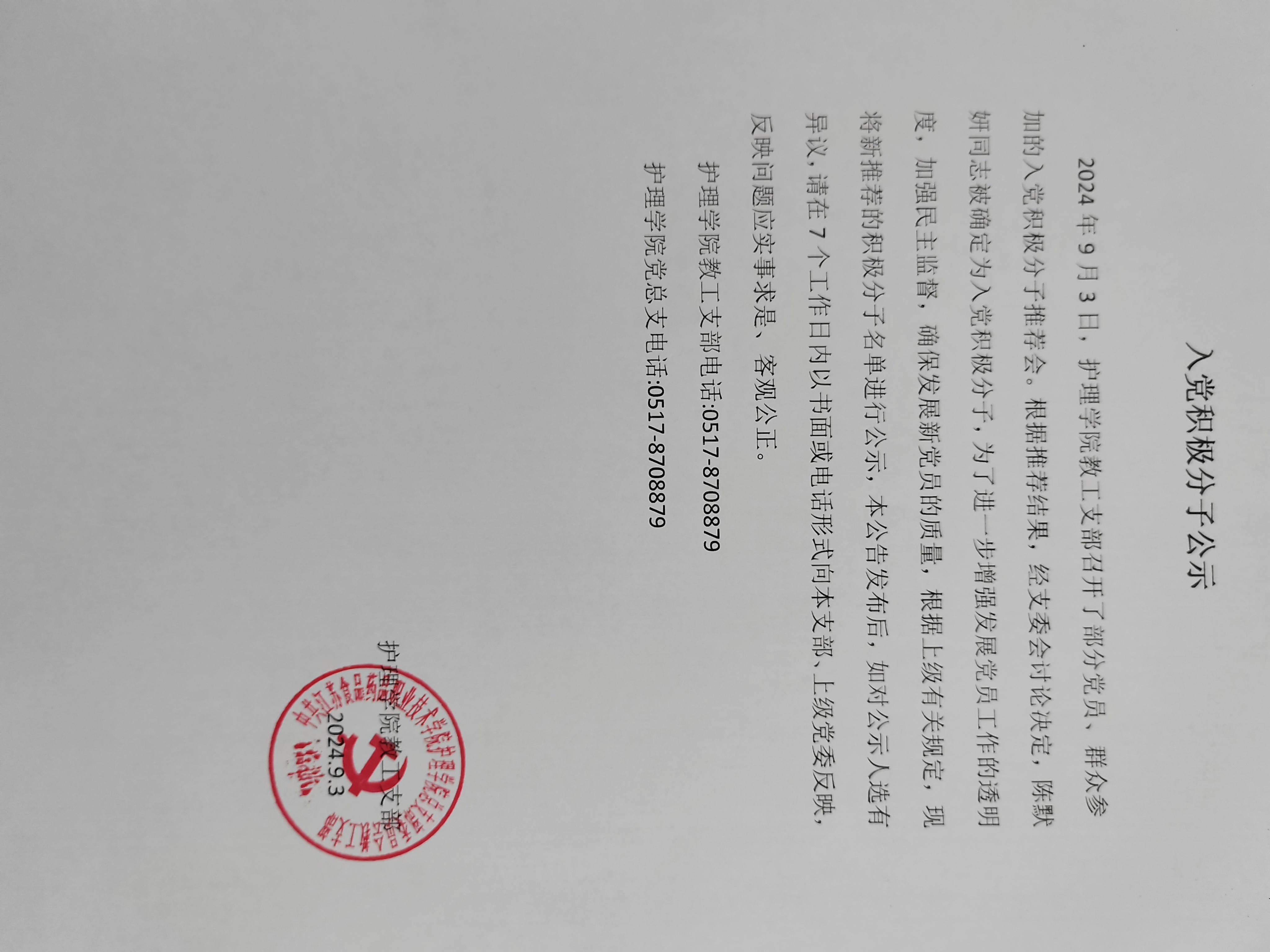 2024年9月3日,公司教工支部召开了部分党员、群众参加的入党积极分子推荐会。根据推荐结果,经支委会讨论决定,陈默妍同志被确定为入党积极分子,为了进一步增强发展党员工作的透明度,加强民主监督,确保发展新党员的质量,根据上级有关规定,现将新推荐的积极分子名单进行公示,本公告发布后,如对公示人选有异议,请在7个工作日内以书面或电话形式向本支部、上级党委反映,反映问题应实事求是、客观公正。