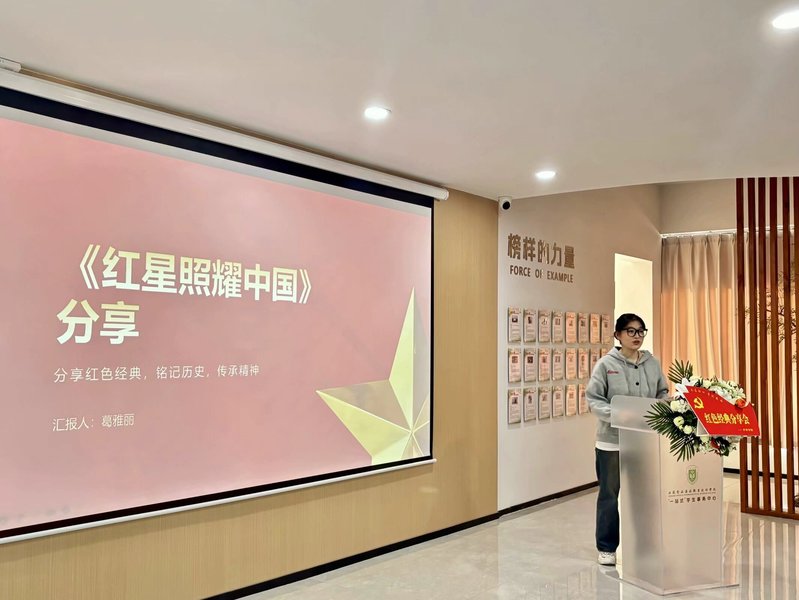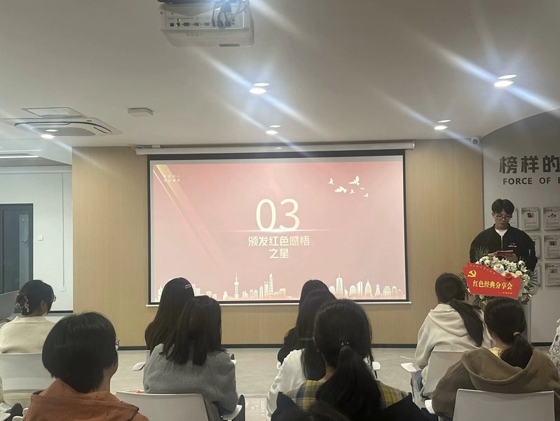 活动中,党员发展对象厉耀阳同学开场致辞,对活动进行简要介绍,强调本次活动的重要性和意义,鼓励大家积极参与。接着五名入党积极分子分别分享了红色故事。护理231葛雅丽分享了红色经典书籍《红星照耀中国》,护理233刘静雯同学分享了中国年龄最小的革命烈士—宋振中,护理234郑鹏羽分享了红色经典书籍《红岩》,护理245祁小凡同学分享了抗日名将杨靖宇和视死如归刘胡兰女士的英雄伟绩,护理231王佳斌同学,通过铁道游击队,志愿军第七穿插连的英勇事迹,激起同学们强烈的民族自豪感和认同感。最后,同学们共同观看了红色纪录片,向革命先烈致敬此外,公司为“红色感悟之星”颁发荣誉证书,鼓励更多的员工参与红色经典分享与传承。