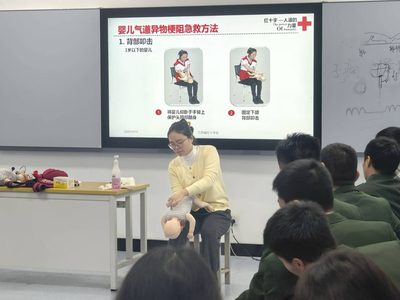 活动现场,主讲人王露老师和曾静老师采用理论和实际教学,利用PPT以生动的案例和通俗的语言,向大家讲解急救知识的重要性。理论结束后,王露老师使用“假人”向在场人员详细地演示和讲解,如何进行正确的心肺复苏、胸外按压、人工呼吸等步骤,曾静老师使用“假娃娃”教学海姆立克急救法、骨折固定以及止血包扎等方法,现场学习氛围高涨。