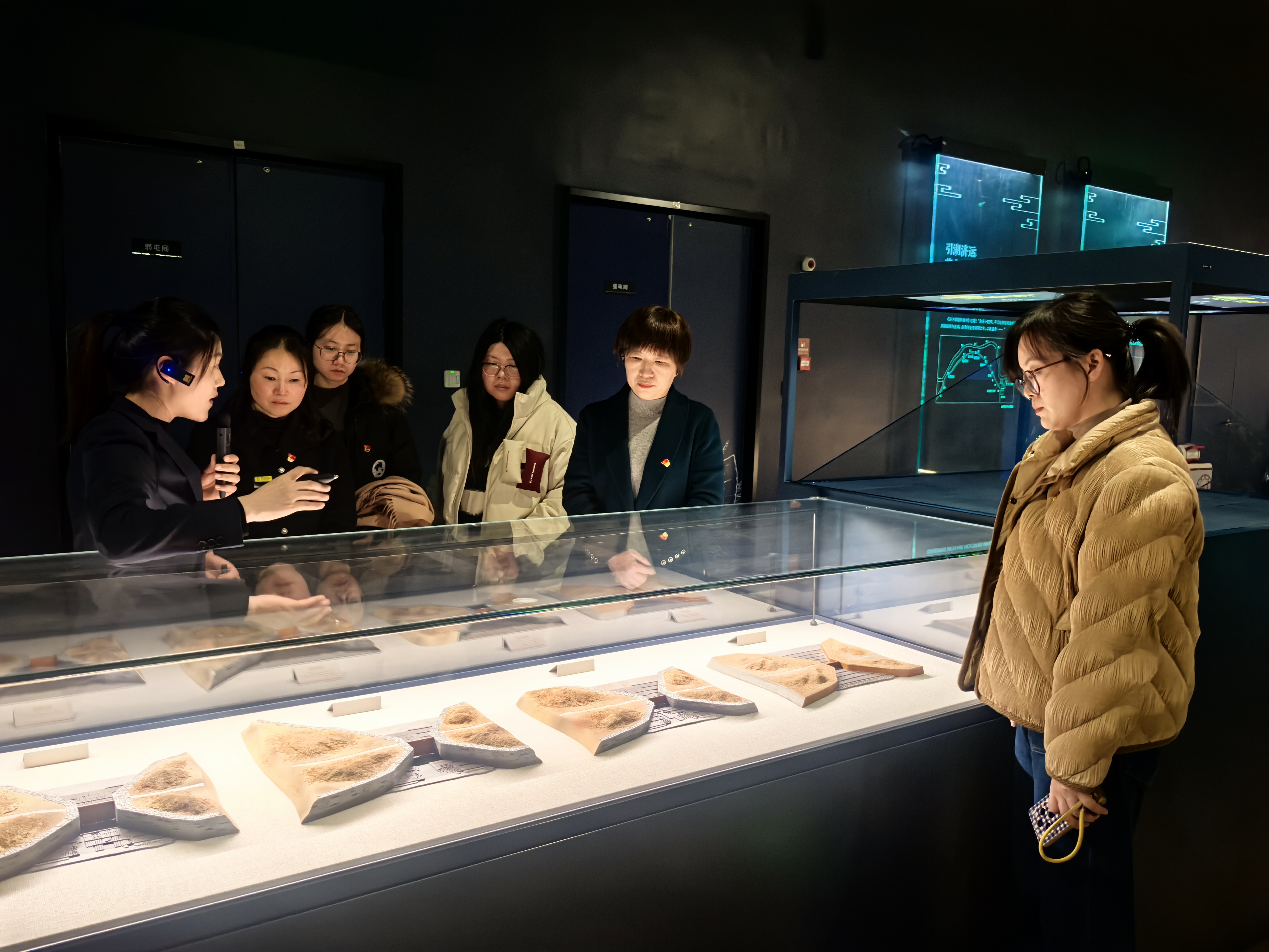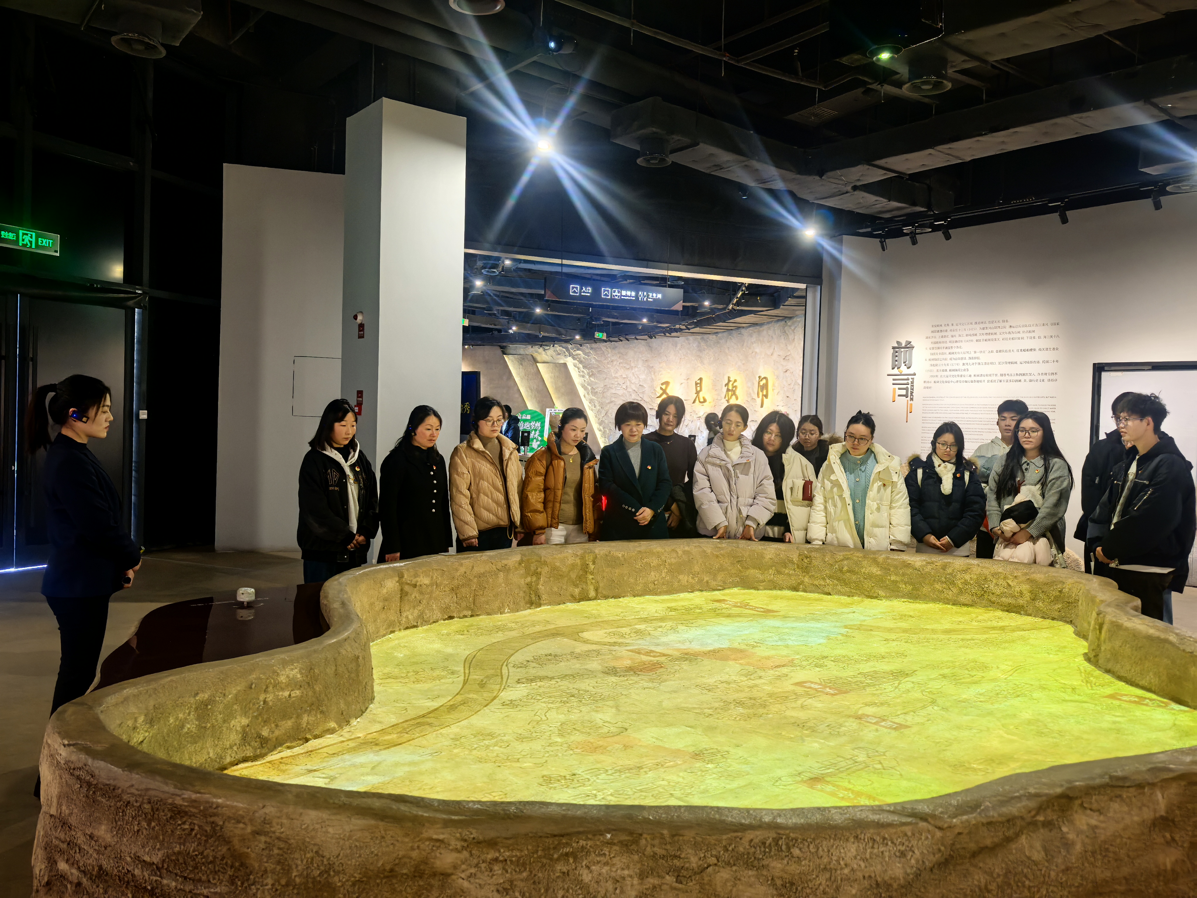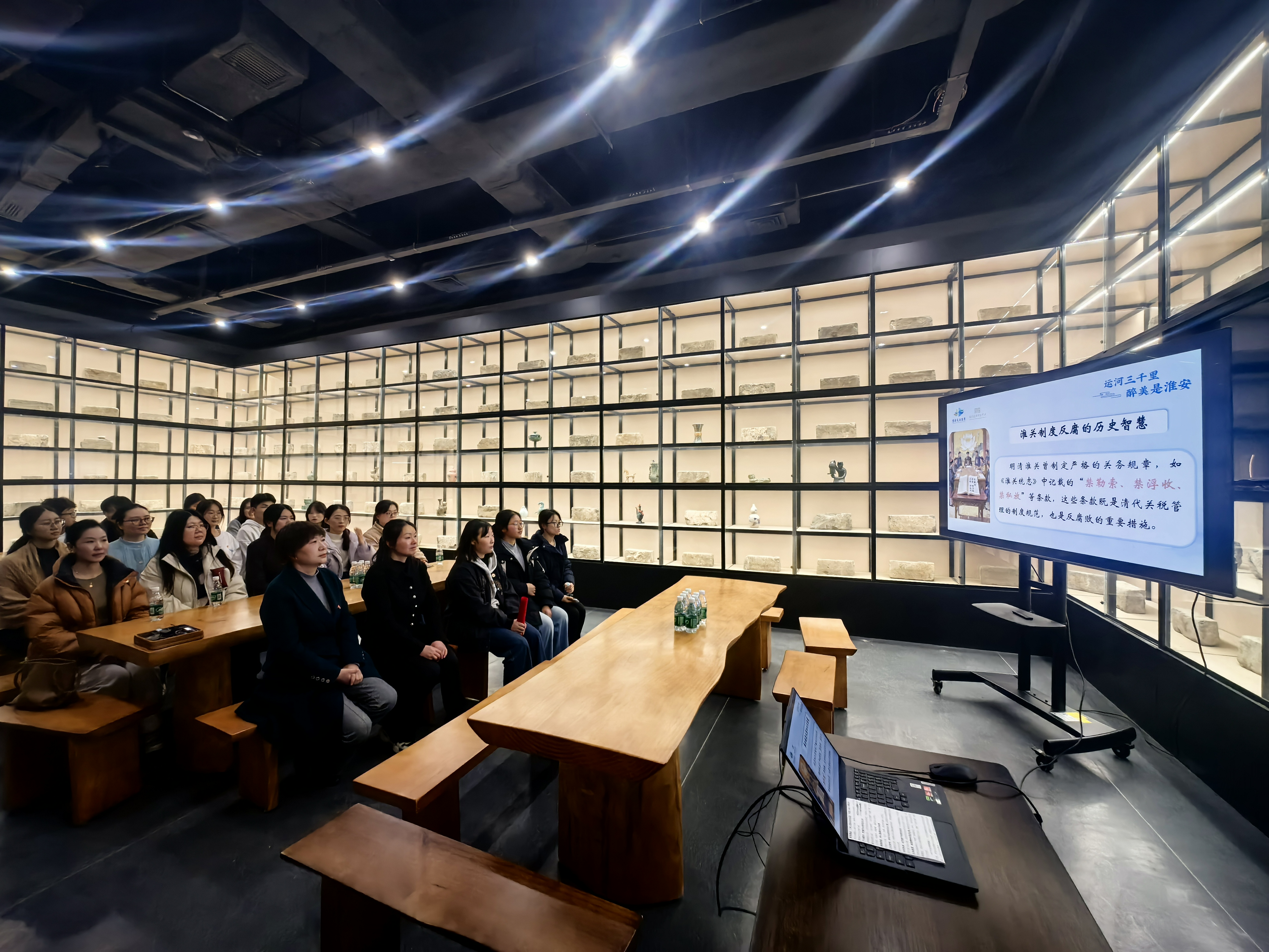 板闸遗址是中国大运河项目成功入选世界文化遗产名录之后的重大考古发现,承载着深厚的历史文化底蕴,见证了淮安曾经的繁荣与变迁。师生们首先来到板闸遗址文化体验中心,在讲解员的带领下,依次参观了各个展厅。师生通过观看珍贵的历史文物、聆听生动的讲解、参与新颖的互动体验,近距离观看“闸体+古河道”遗址,直观感受到了古代水利工程智慧与大运河“流动的文化”特质,进一步认识到各民族在交流交融中共同创造了灿烂的中华文化。在交流环节,讲解员生动讲述了榷关作为税收重地、稽查枢纽的历史功能及其制度设计,深刻揭示了“水能载舟,亦能覆舟”“权力必须关进制度笼子”等历史警示。